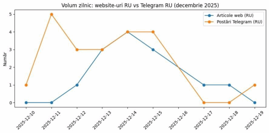 Setul de date include 13 articole publicate pe website-uri de știri în limba rusă și 21 de postări publicate pe Telegram, într-un interval relativ scurt, în perioada 10-19 decembrie 2025. Din punct de vedere temporal, datele indică un val informațional clar delimitat, cu un debut mai timpuriu pe Telegram și o consolidare ulterioară pe website-uri.