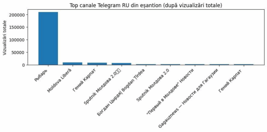 În Telegram, distribuția este mai concentrată. Câteva canale generează volum (ex. „Гений Карпат”, „Sputnik Moldova 2.0”), dar impactul real este măsurat de audiență, în special un canal major care atinge peste 200.000 de vizualizări cu o singură postare. Acest dezechilibru între volum și reach este esențial: un singur nod mare poate avea un impact mai mare decât zeci de canale mici.