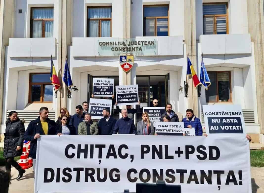 Membri ai USR Constanţa au organizat, joi, în faţa sediului administraţiei locale, un protest faţă de un proiect al primarului liberal Vergil Chiţac prin care, potrivit contestatarilor, peste 800 de metri pătraţi de plajă din Mamaia ar fi vânduţi unei firme conduse de liderul PSD Constanţa, Ion Dumitrache.