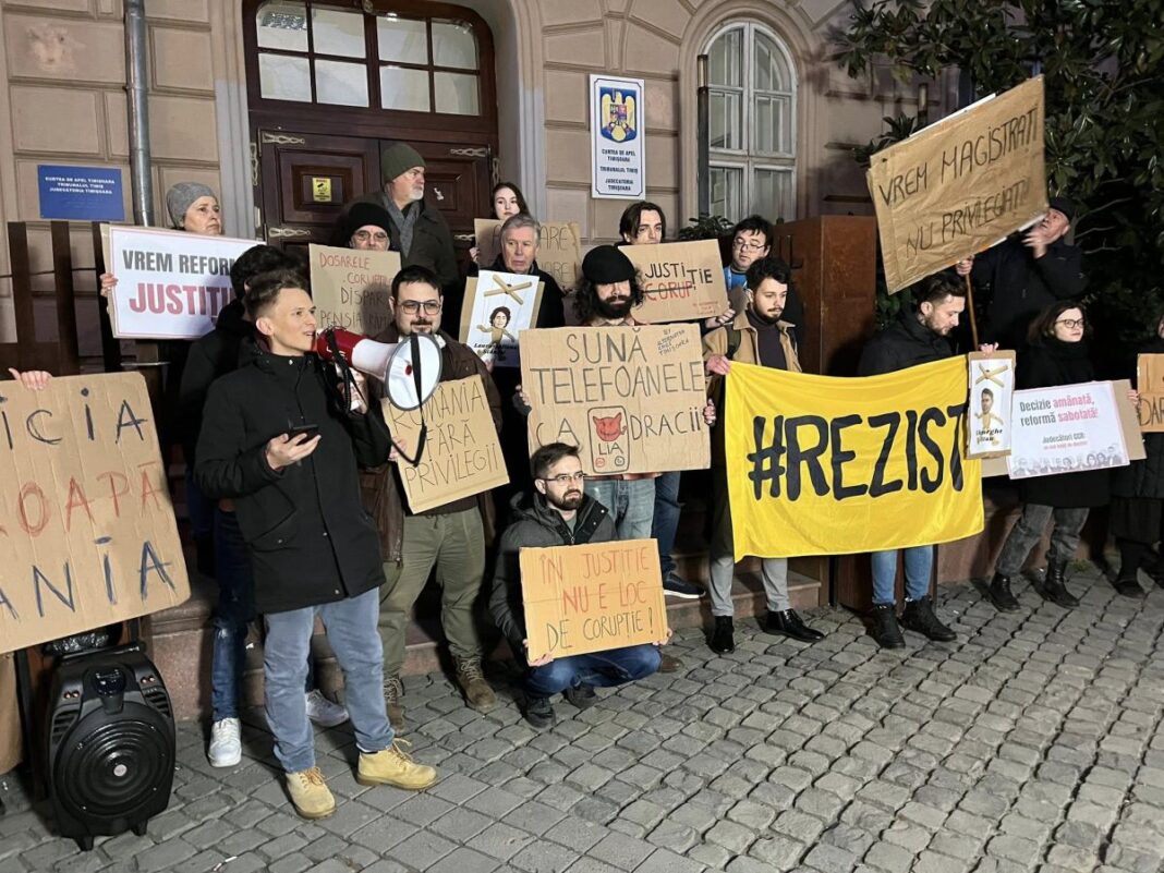 Zeci de persoane au protestat, joi seara, în faţa Palatului Justiţiei din Timişoara împotriva amânării deciziei CCR privind pensiile magistraţilor, informează Agerpres.
