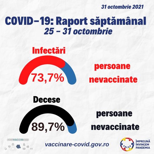 În săptămâna 25 – 31 octombrie 2021, 73.7% din cazurile confirmate au fost înregistrate la persoane nevaccinate.