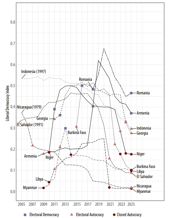 Un raport anual realizat de V-Dem pentru 2025 semnaleaază o degradare a democrației din România. Conform datelor prezentate, procesele democratice din România au început să fie inversate din anul 2021, anul coalizării PSD și PNL. Obstacolele enunțate includ: interferențe ale serviciilor străine de informații, suprimarea societății civile și cenzurarea presei. Punctul culminant al autocratizării este indicat drept momentul anulării alegerilor prezidențiale din 2024. Totuși, raportul admite că procesul de autocratizare din România este mai temperat decât în alte țări aflate în situații similare.