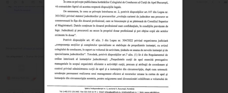 La prima întrebare, CAB, prin semnătura Georgeanei Viorel, noul purtător de cuvânt al instanței, ne-a transmis că respectă legea, deși noi am întrebat de ce nu sunt publice hotărârile colegiului de conducere. „În ceea ce priveşte publicitatea hotărârilor Colegiului de Conducere al Curţii de Apel Bucureşti, vă comunicăm faptul că acestea respectă dispoziţiile legale”, este răspunsul al prima întrebare.