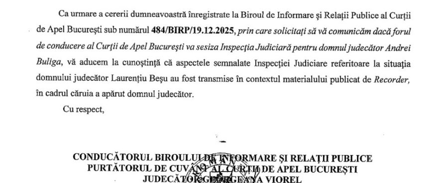La a treia întrebare, dacă va sesiza autoritățile statului pentru a-l verifica pe judecătorul Andrei Buliga, susținător al conducerii, fost angajat al DGIPI și aliniat în spatele președintei Liana Arsenie, la celebra conferință de presă de anul trecut, la fel cum a fost verificat Laurențiu Beșu, noua purtătoare de cuvânt a instanței ne-a transmis un răspuns confuz. „Ca urmare a cererii dumneavoastră înregistrate la Biroul de Informare şi Relaţii Publice al Curţii de Apel Bucureşti sub numărul 484/BIRP/19.12.2025, prin care solicitaţi să vă comunicăm dacă forul de conducere al Curţii de Apel Bucureşti va sesiza Inspecția Judiciară pentru domnul judecător Andrei Buliga, vă aducem la cunoştinţă că aspectele semnalate Inspecției Judiciare referitoare la situaţia domnului judecător Laurențiu Beşu au fost transmise în contextul materialului publicat de Recorder, în cadrul căruia a apărut domnul judecător” este răspunsul semnat de Georgeana Viorel, purtătorul de cuvânt al CAB.