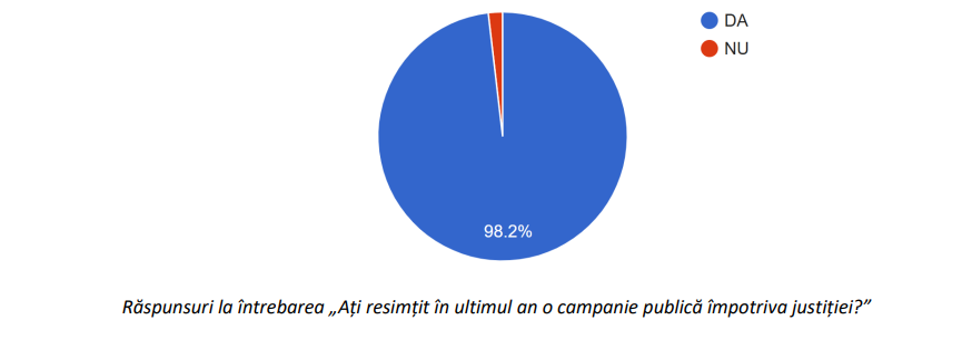 - 98.2% din participanți au răspuns pozitiv la întrebarea „Ați resimțit în ultimul an o campanie publică împotriva justiției?”.