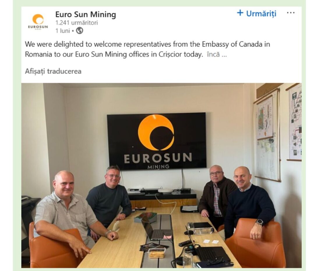 Tot pe pagina de LinkedIn, Euro Sun Mining se laudă că are și sprijinul Ambasadei Canadei în România (la fel cum a avut și Gabriel Resources). Reprezentanții Ambasadei au confirmat postarea ESM, lăudând expertiza Canadei în domeniul mineritului global. Este însă, această expertiză una model, întreabă România Curată?