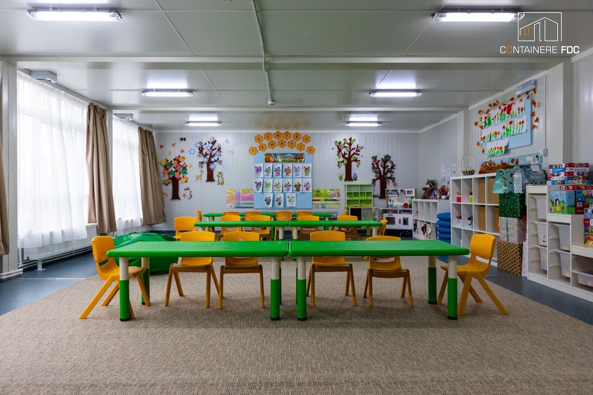 Pe lângă suprafață, apare nevoia de separare clară a activităților. Sălile de grupă nu mai pot găzdui simultan joaca, masa și odihna. Programele prelungite cer spații dedicate pentru somn, afterschool sau activități tematice. Timpul nu permite mereu o construcție tradițională, iar containerele modulare devin o opțiune practică.