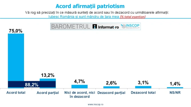Conform unui sondaj INSCOP, citat de Informat.ro, marea majoritate a românilor (peste 88%) declară că își iubesc țara. La afirmația „Iubesc România și sunt mândru de țara mea!”, 75% din respondenți au exprimat acord total, iar 13.2% acord parțial.