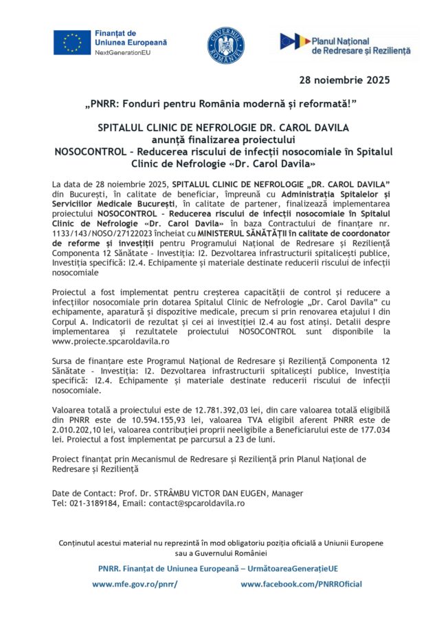 Uniunea Europeană ActualitateLa ziComunicate de presă SPITALUL CLINIC DE NEFROLOGIE DR. CAROL DAVILA anunță finalizarea proiectului NOSOCONTROL – Reducerea riscului de infecții nosocomiale în Spitalul Clinic de Nefrologie «Dr. Carol Davila» Articol scris de: PressHUB Data: 28/11/2025 Articolul precedentCraiova, locul I într-un top european al celor mai frumoase târguri de Crăciun PressHUBCea mai răspândită rețea de presă din România! LĂSAȚI UN MESAJ Renunțați la răspuns Comentariu: Vă rugăm să introduceți comentariul dvs.! Nume:* Introduceți aici numele dvs. Email:* Ați introdus o adresă de e-mail incorectă! Vă rugăm să introduceți adresa dvs. de e-mail aici Website: Salvați numele meu, adresa de e-mail și site-ul web în acest browser pentru data viitoare i comentariu. Leave this field empty Distribuie articolul FacebookTwitterWhatsAppLinkedinReddItEmailImprimareTelegram Ultimele știri Craiova, locul I într-un top european al celor mai frumoase târguri de Crăciun Premierul Ilie Bolojan: Execuția bugetară pe primele 10 luni ale anului: deficitul scade, încasările din TVA cresc constant Consiliul Județean Cluj, prima instituție publică din România complet digitalizată pentru cetățeni Aktual24 | Armenia părăsește Organizația Tratatului de Securitate Colectivă, considerată „NATO-ul rusesc” Se deschide Târgul de Crăciun din Oradea. Programul concertelor și spectacolelor Abonează-te la newsletter-ul nostruPentru a fi la curent cu cele mai recente știri, oferte și anunțuri speciale.Abonează-te Mai multe articole similareRelated Craiova, locul I într-un top european al celor mai frumoase târguri de Crăciun PressHUB - 27/11/2025 Craiova a obţinut anul acesta locul I în competiţia... Premierul Ilie Bolojan: Execuția bugetară pe primele 10 luni ale anului: deficitul scade, încasările din TVA cresc constant PressHUB - 27/11/2025 Premierul Ilie Bolojan a anunțat că din execuția bugetară... Consiliul Județean Cluj, prima instituție publică din România complet digitalizată pentru cetățeni PressHUB - 27/11/2025 Președintele Consiliului Județean (CJ) Cluj, Alin Tișe, a anunțat... Se deschide Târgul de Crăciun din Oradea. Programul concertelor și spectacolelor PressHUB - 27/11/2025 Târgul de Crăciun din Oradea, unul dintre cele mai...