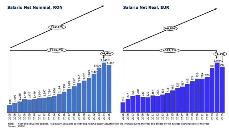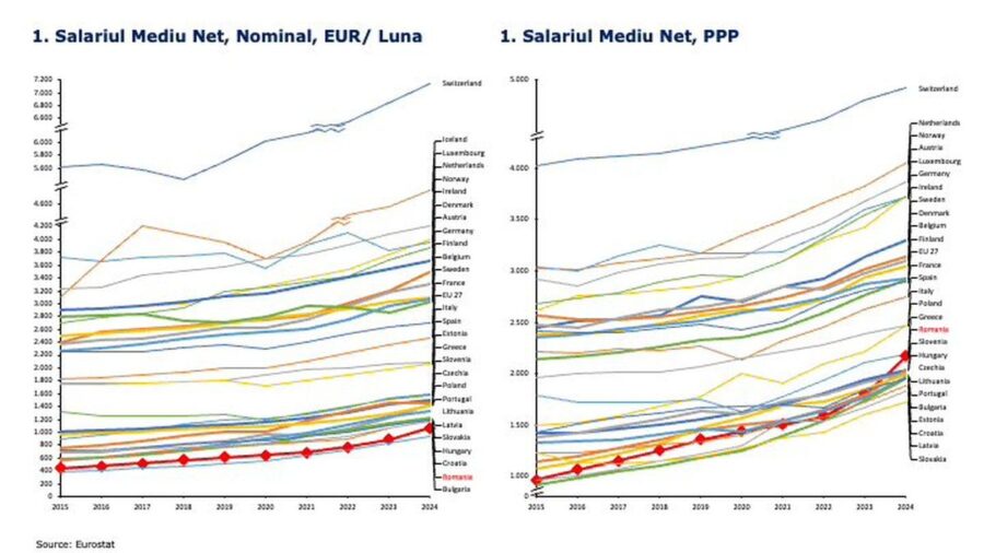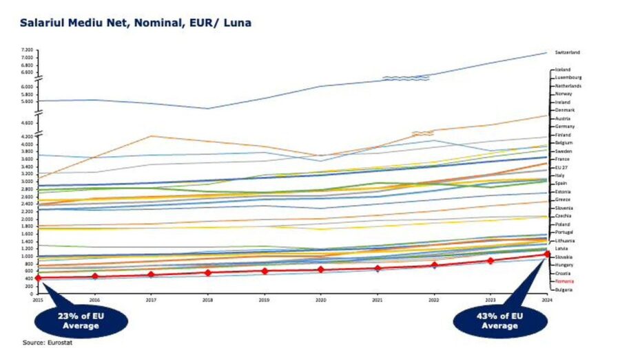 La sfârșitul anului 2024, salariul mediu din România era al doilea cel mai mic din UE (43% din media europeană); asta după ce a crescut în ultimii 20 de ani de 6 ori în termeni nominali și de 4 ori în termeni reali. Creșterea pare mare, dar să nu uităm că acum 20 de ani salariul mediu din România nu era decât 23% din media UE: pe atunci nici povestea că „ajustat la puterea de cumpărare stăm bine” nu avea nici o șansă să pară credibilă.