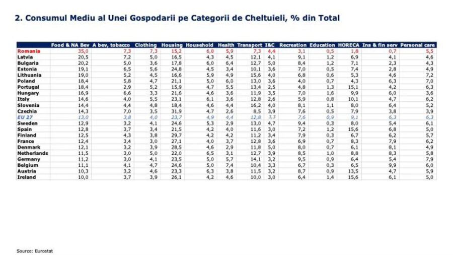 Păi se ia consumul mediu pe categorii de costuri; vreo 35% din el se duce pe produse de bază (mâncare și băuturi ne-alcoolice), de departe cea mai mare pondere din UE, ceea ce în sine ridică multe întrebări.