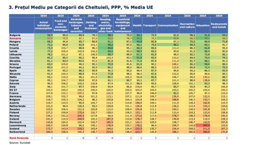 Și se constată că avem cele mai mici costuri din Europa la 5 din 11 categorii și la încă 3 suntem pe locul 2. Doar la băuturi alcoolice și tutun stăm mai prost (locul 6 din UE) – o categorie mare de cheltuieli la noi.