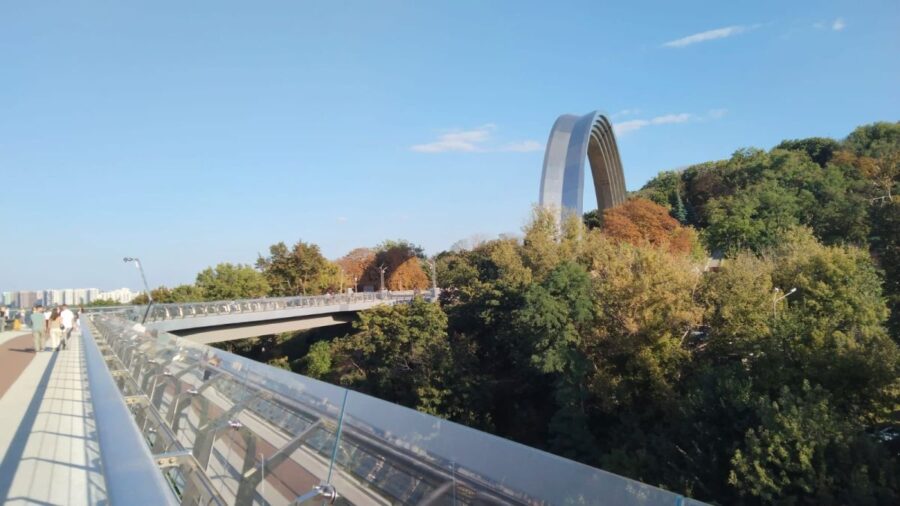 Parcul Parcul Khreshchaty, în depărtare se vede fostul Arc al Prieteniei, actualul Arc al Independenței Poporului Ucrainean, septembrie 2025