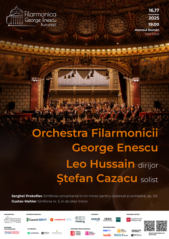 Un tur de forță artistică cu dirijorul Leo Hussain și violoncelistul Ștefan Cazacu pe scena Ateneului în concertele simfonice din 16 și 17 octombrie Publicul va asculta două lucrări emblematice ale repertoriului secolului XX: Simfonia concertantă de Serghei Prokofiev, considerată de mulți drept cel mai dificil concert pentru acest instrument compus vreodată, și Simfonia nr. 5 de Gustav Mahler. Mai sunt foarte puține bilete pe www.oveit.com sau direct la linkul https://oveit.com/hub/org/l7PDAr7y Întregul program al Stagiunii poate fi văzut la acest link https://filarmonicaenescu.ro/ro/evenimente.