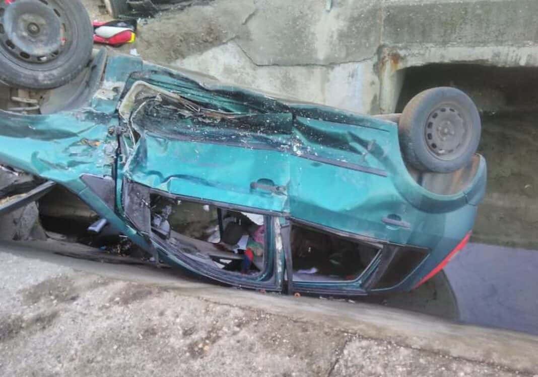 În urma impactului, una dintre maşini a ajuns răsturnată în şanţul de pe marginea drumului.