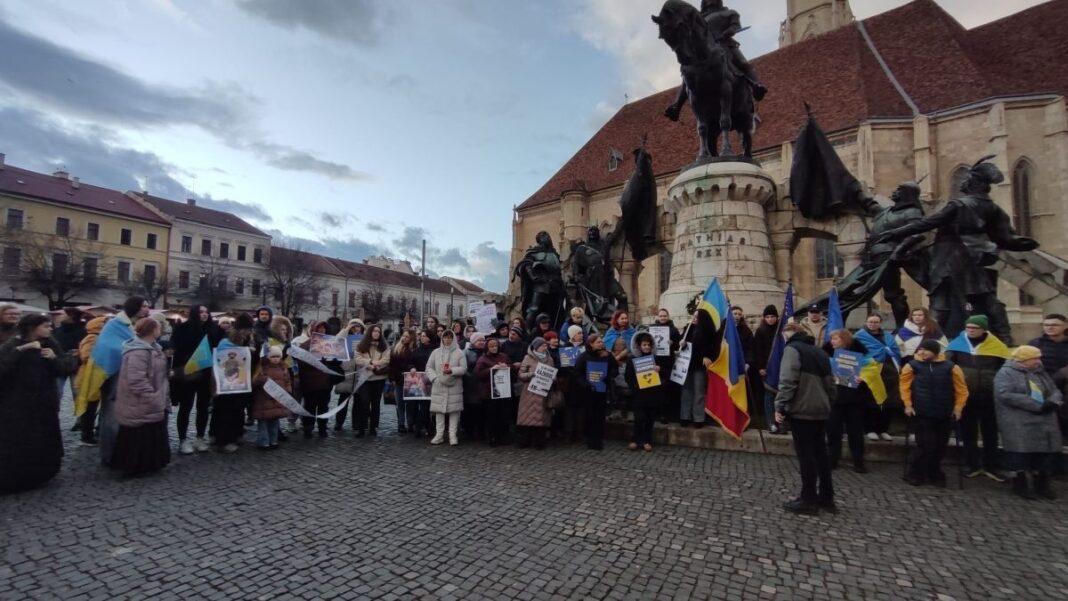 Zeci de persoane au comemorat, marţi, la Cluj-Napoca, patru ani de la invazia rusă în Ucraina, într-o manifestaţie în Piaţa Unirii, organizată de filiala Cluj a Asociaţiei Tinerilor Ucraineni din România, informează Agerpres.